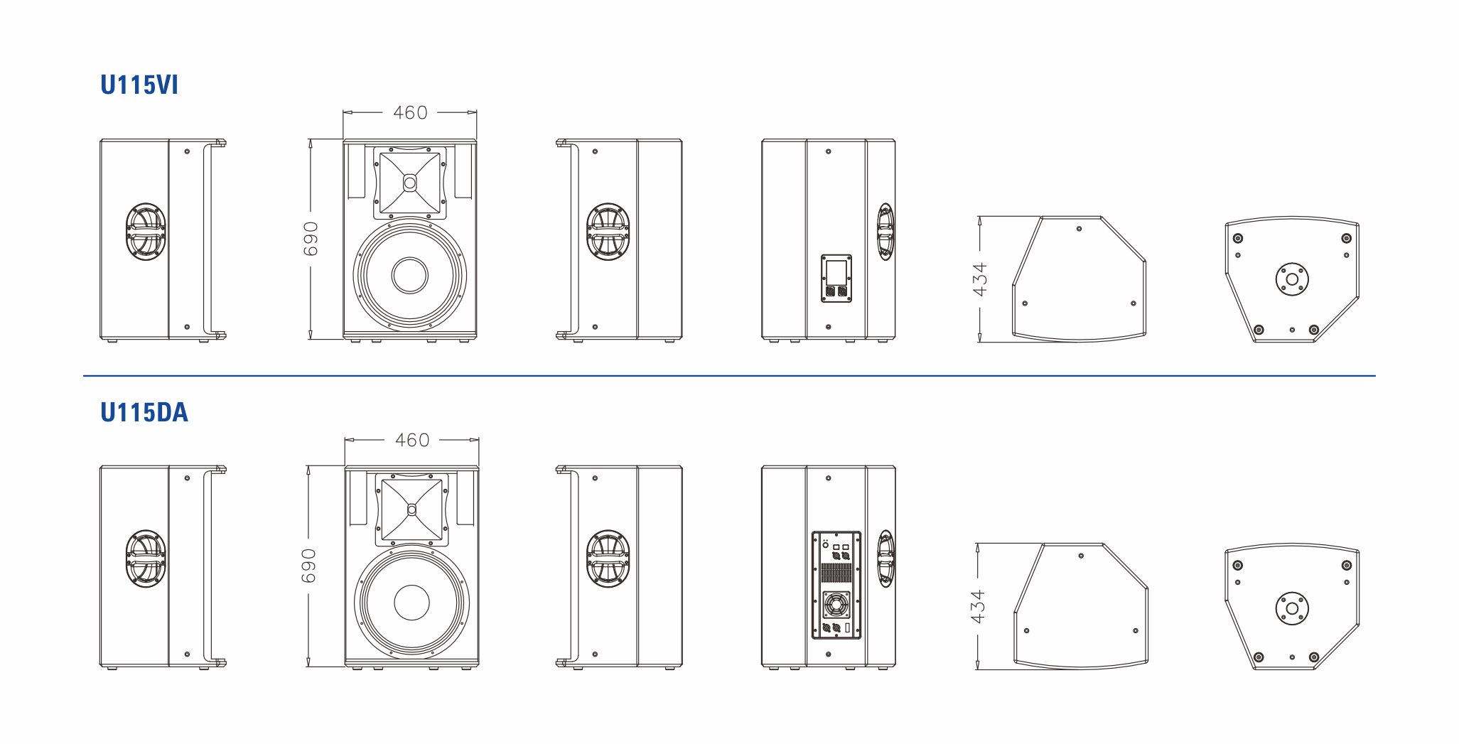 U115VI是一款15"兩分音全頻音箱,具有音質明亮、有力度等特點。單元配置:1只15"高效率中低音單元,1只1.4"喉口75芯復合振膜高音驅動器配置90°×40°可旋轉號角。箱體采用多層復合夾板,耐磨聚脲噴涂。 U115DA是一款兩通道帶DSP的有源音箱。