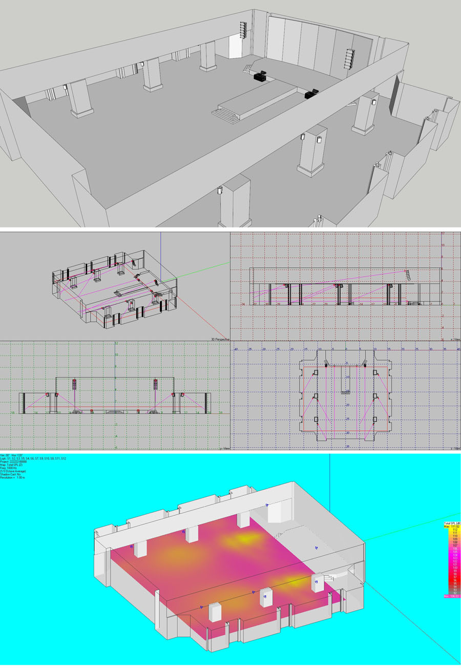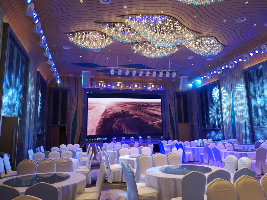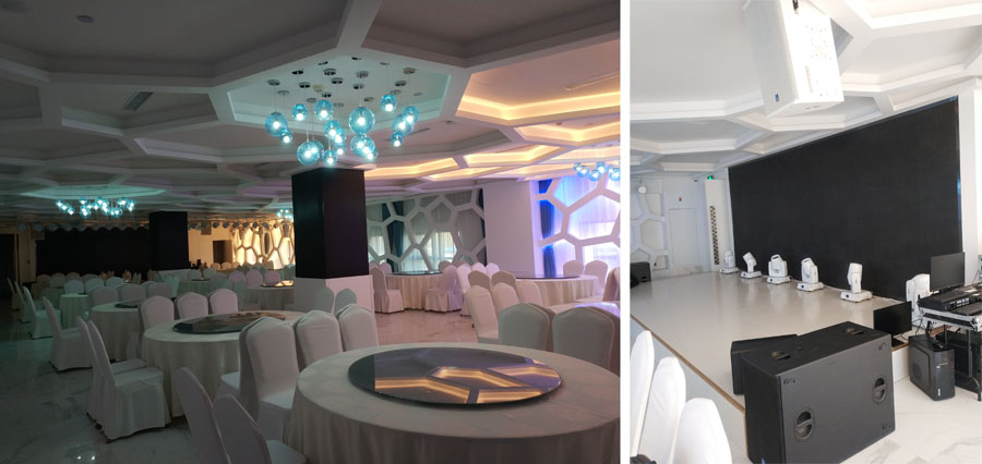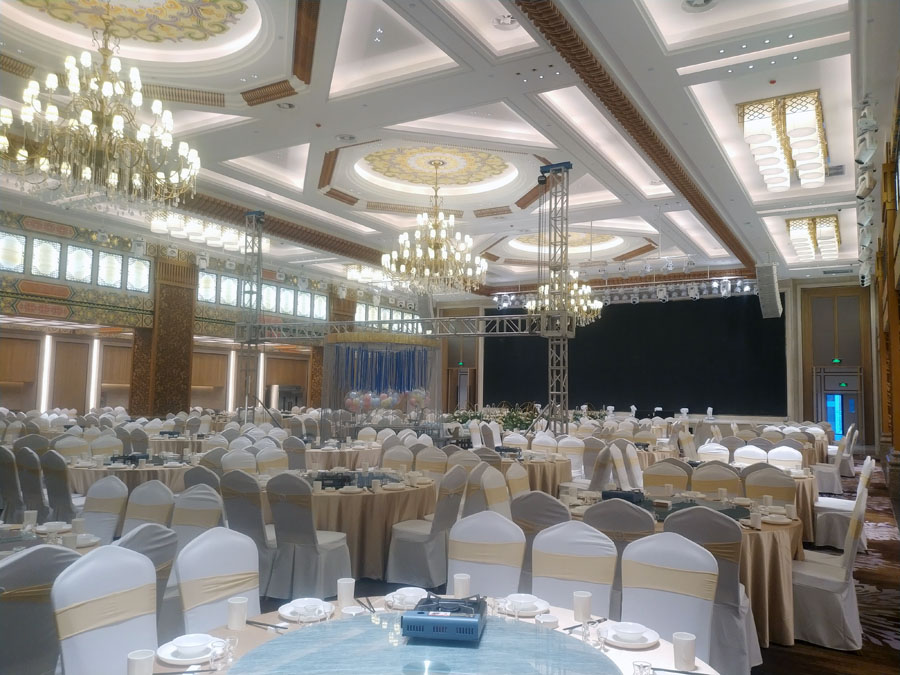 以中國傳統文化為主題,結合以當代時尚蒙元文化,兩者交相輝映,重新演繹中國傳統魅力,完美詮釋出“碧瓦朱甍·流光溢彩”。從現場環境設計入手,結合計算機軟件模擬計算分析,滿足廳堂擴聲一級標準。酒店首場婚宴在金色大廳順利舉行,獲得主持人和樂隊成員的一致好評。金色大廳宴會廳主擴音箱選用定制白色MLA110線陣列音箱。