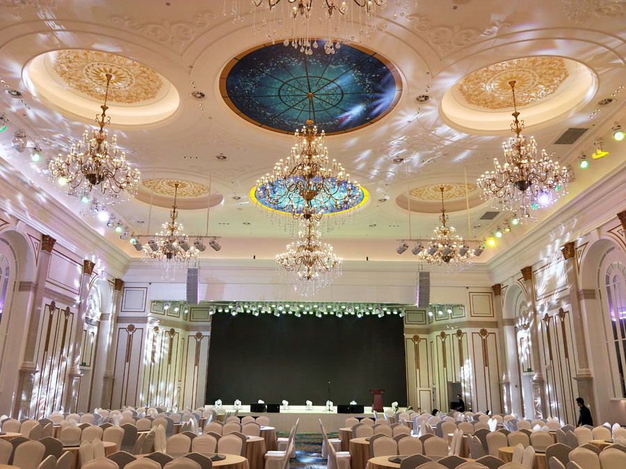 以眼觀世界為主題,用寶石的幽若藍光點點輝映著整個略帶神秘色彩的宴會廳,簡潔流暢的線條搭配富麗典雅的香檳金色,給人以尊貴優雅之感。覽世盛景宴會廳主擴聲音箱選用定制白色MLA110線陣列音箱。