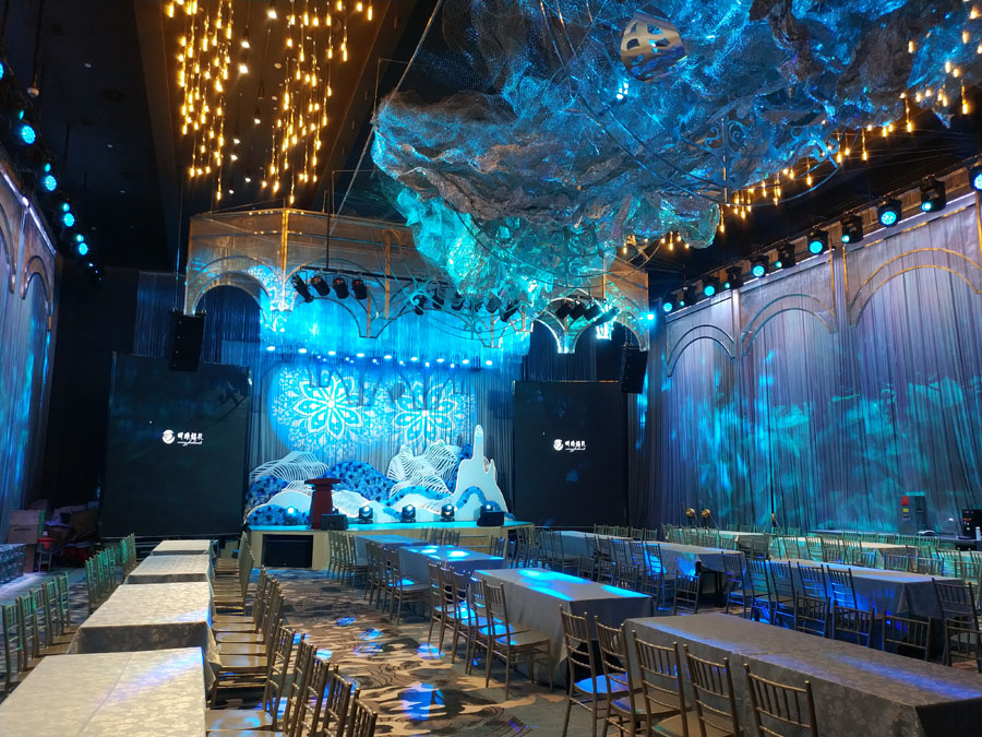 浮世流光宴會廳是本酒店唯一沒有裝修的宴會廳,通過婚禮設計師的設計,利用先進的聲、光、影技術可以搭配出前所未有的體驗。浮世流光宴會廳主擴聲音箱選用黑色MLA110線陣音箱。
