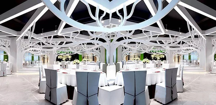 胡楊固守著千年不變的信念、百折不撓的靈魂。以胡楊為題,用光剪影出胡楊林。胡楊之戀宴會廳主擴聲音箱選用定制的白色緊湊型雙十二寸音箱K312。